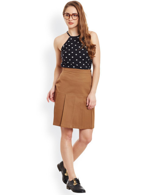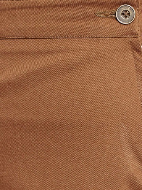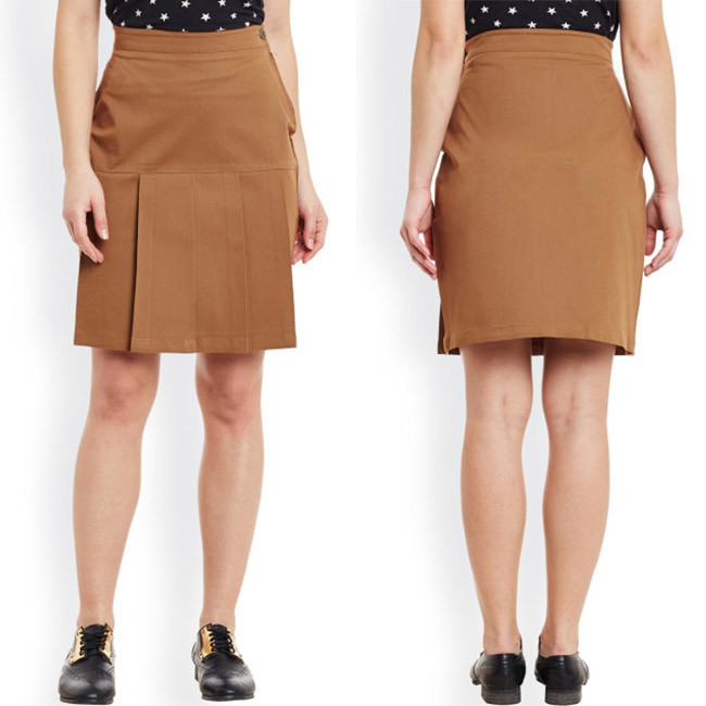 | Ontwerp: | De bruine geweven rok van Aline, heeft een broeksband, een pitvlieg met knoopsluiting op één zij, geplooid detail op de voorzijde | |