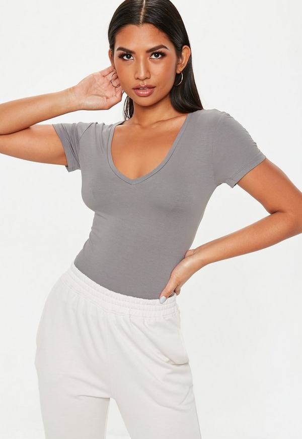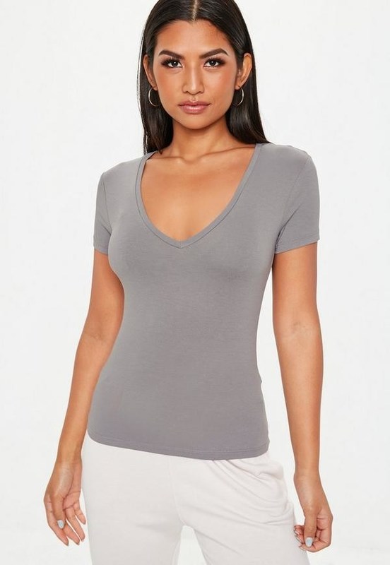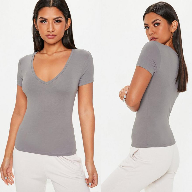 Femmes d'habillement de T-shirt adaptées par décolleté en V gris