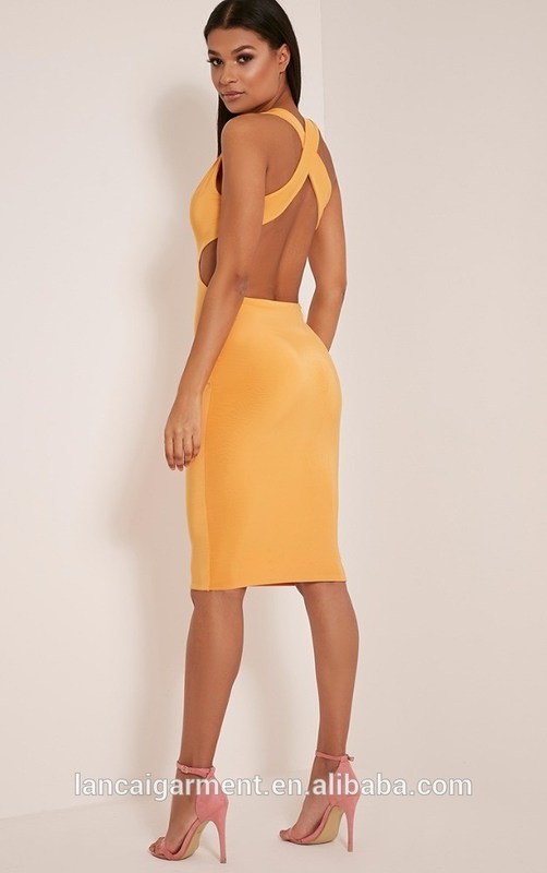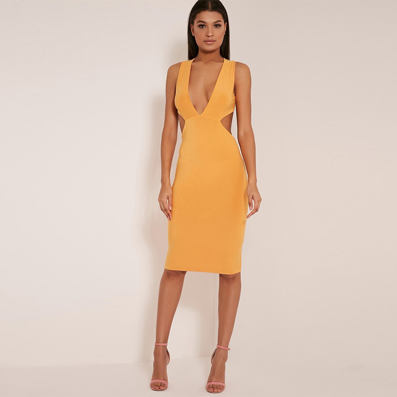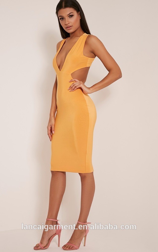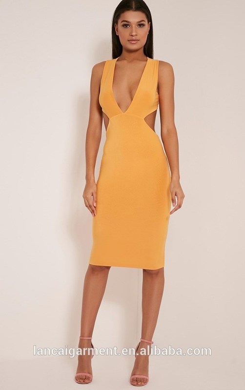2016 Sexy kobiety biddy pastelowe pomarańczowe głębokie V skośna sukienka midi LC6826-A