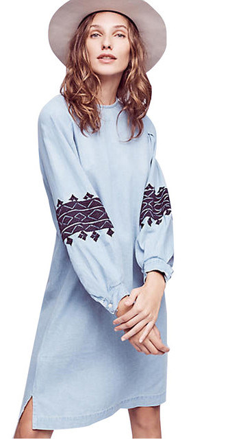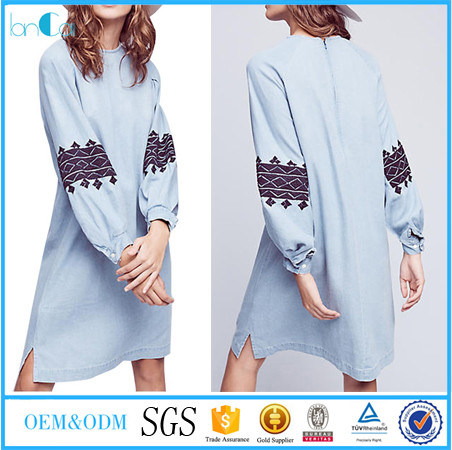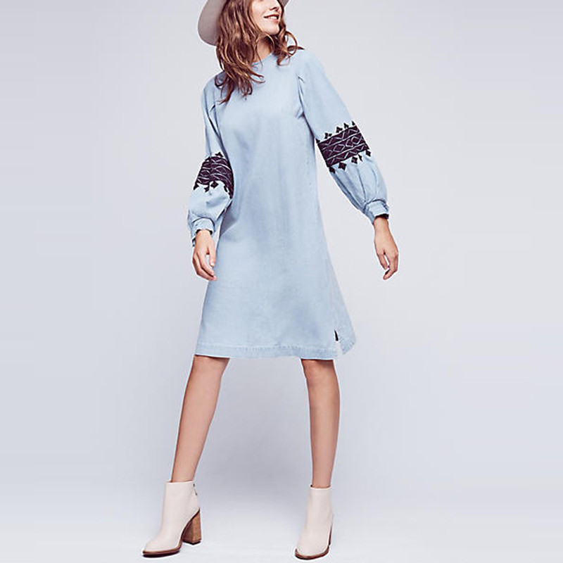 Самая последняя длинная синь женщин весны рукава вышила платью футболки