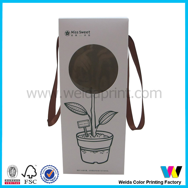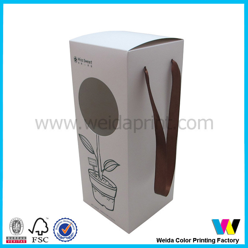 Round Cut Window on Front Paper Packaging Boxes with Brown Ribbon Handle