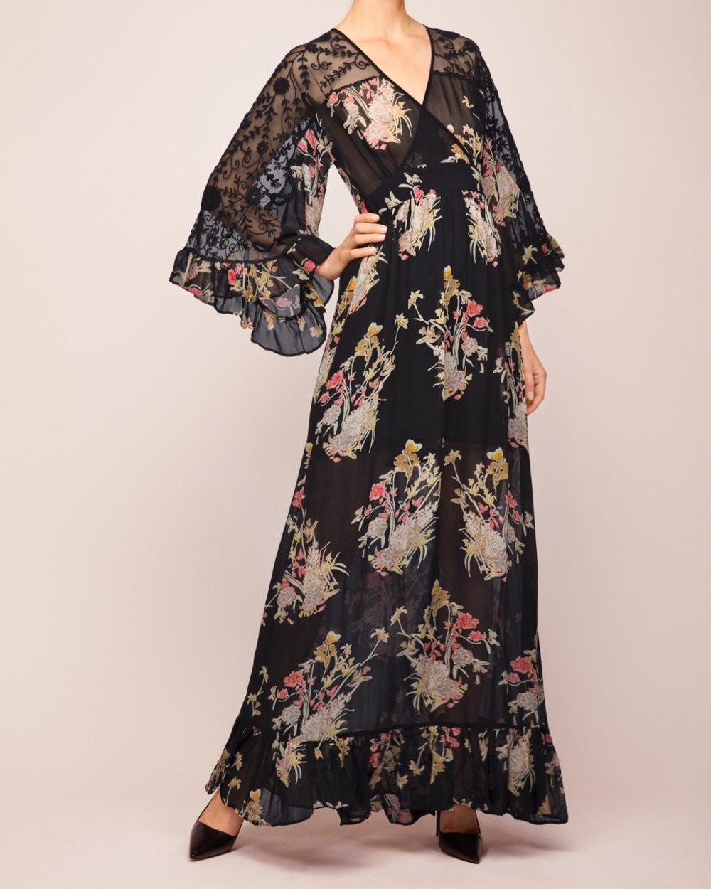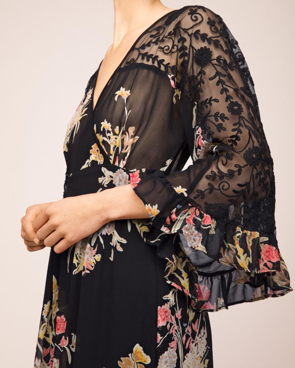 เดรสแขนยาวพิมพ์ลายดอกไม้ v-neckline สำหรับผู้หญิง
