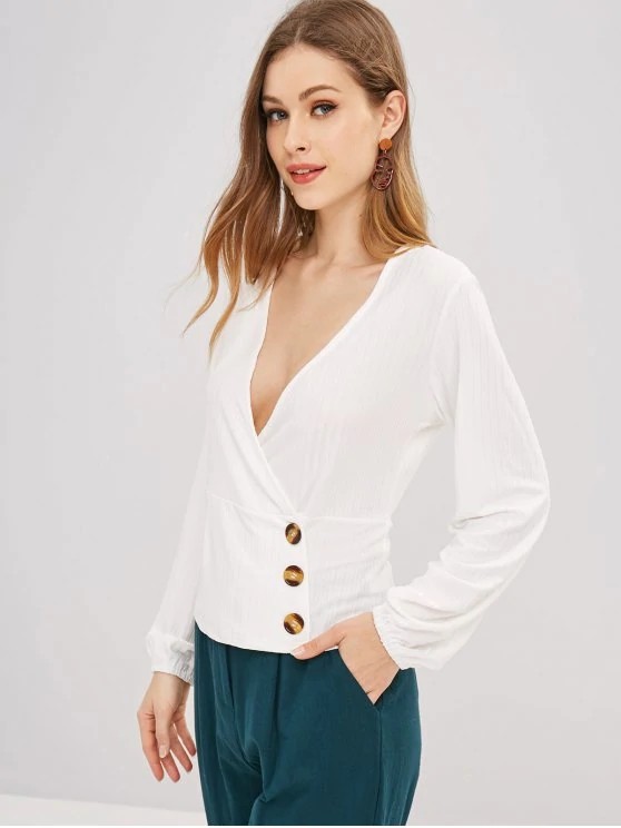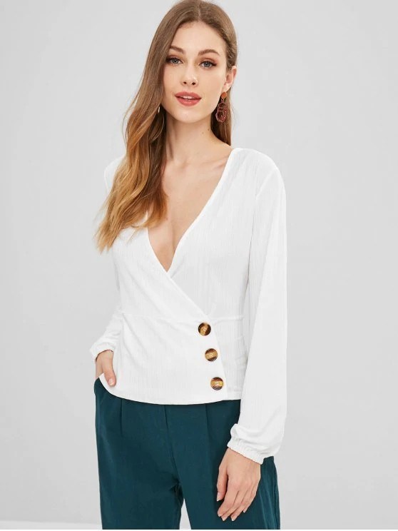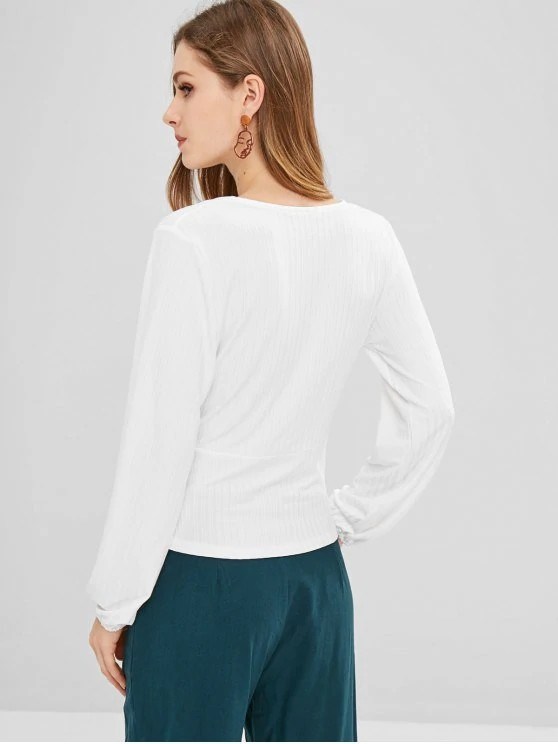 | Style: | Casual | Product name: | Long Sleeve Ribbed Buttoned Crossover Top T Shirt Clothing Women |