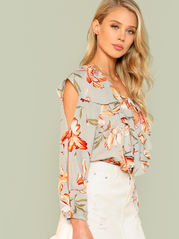 | ออกแบบ: | การออกแบบคอ V ลึกแขนยาวพิมพ์ลายดอกไม้แขนแยก | |