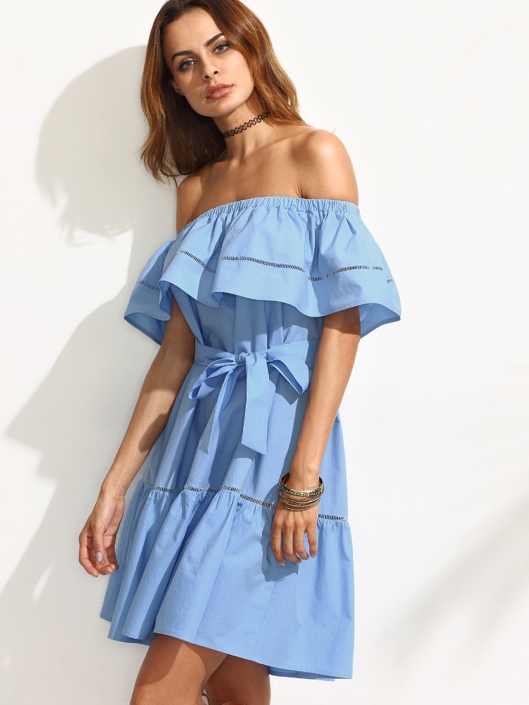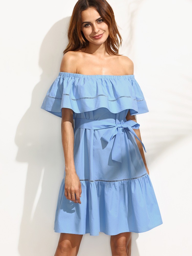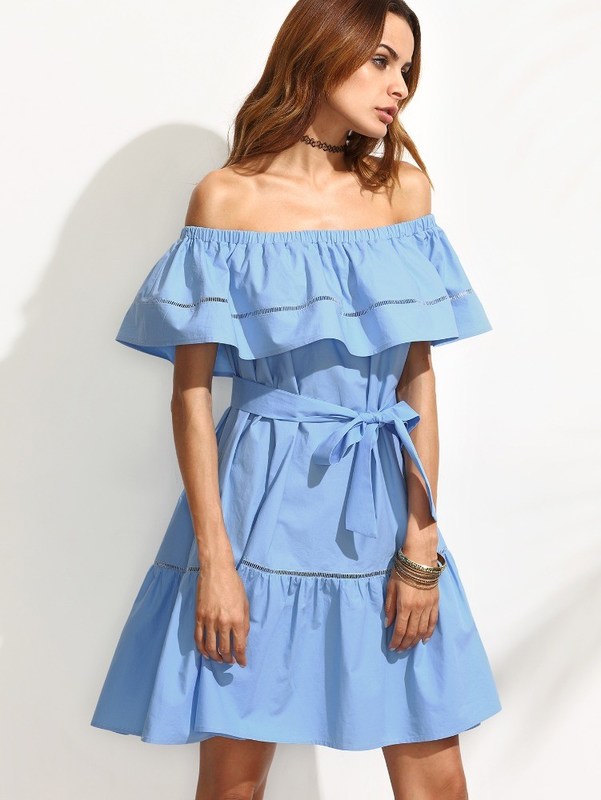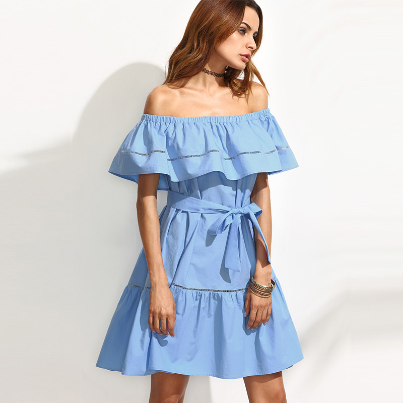Moda mavi kravat bel hollow insert omuz pamuk şemsiye elbise kapalı fırfır