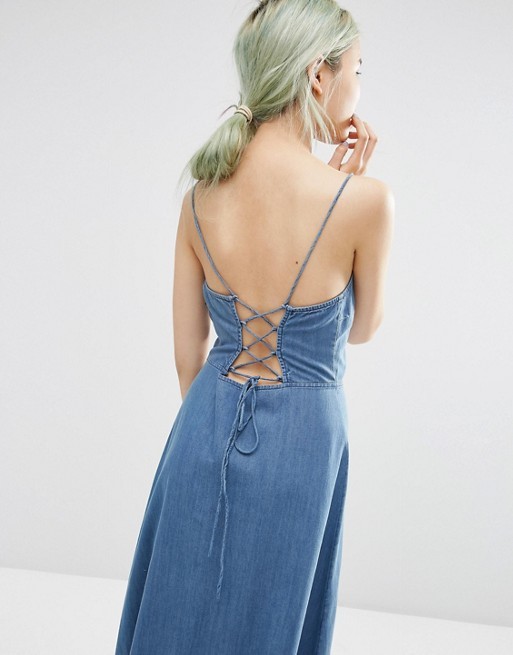 Ürün Adı: Yıkanmış Pamuklu Bağcıklı Kravatlı Maxi Elbise Bağcıklı Denim Tek Parça Elbise LC3029-G