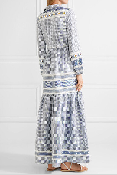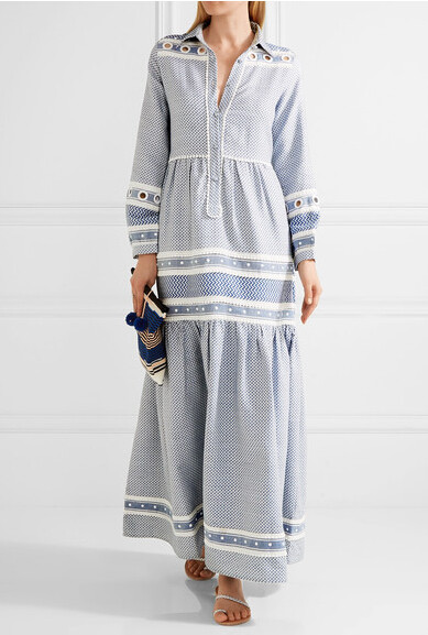 Tığ işi dantel süslemeli kısma yaka maksi elbise